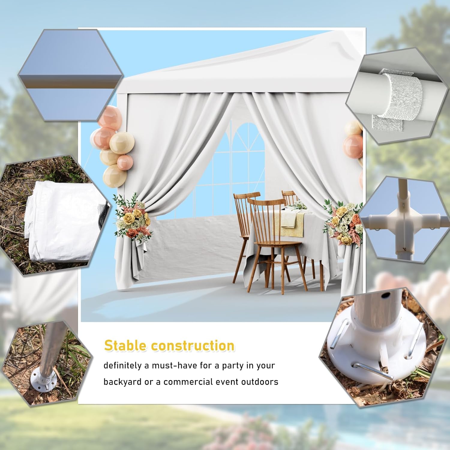 Constructed with high-quality materials, this waterproof tent is built to withstand various weather conditions, ensuring that your event can go on rain or shine. The durable frame and sturdy construction offer stability and support, giving you peace of mind during your event.
