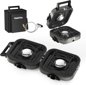 2-Burner Camping Stove Foldable, Portable Propane Camp Stove with 16000 BTU Adjustable Burners and Piezo Ignition, Folding Stove with Carry Bag & Handle for Camping, Tailgating, Backyard BBQ